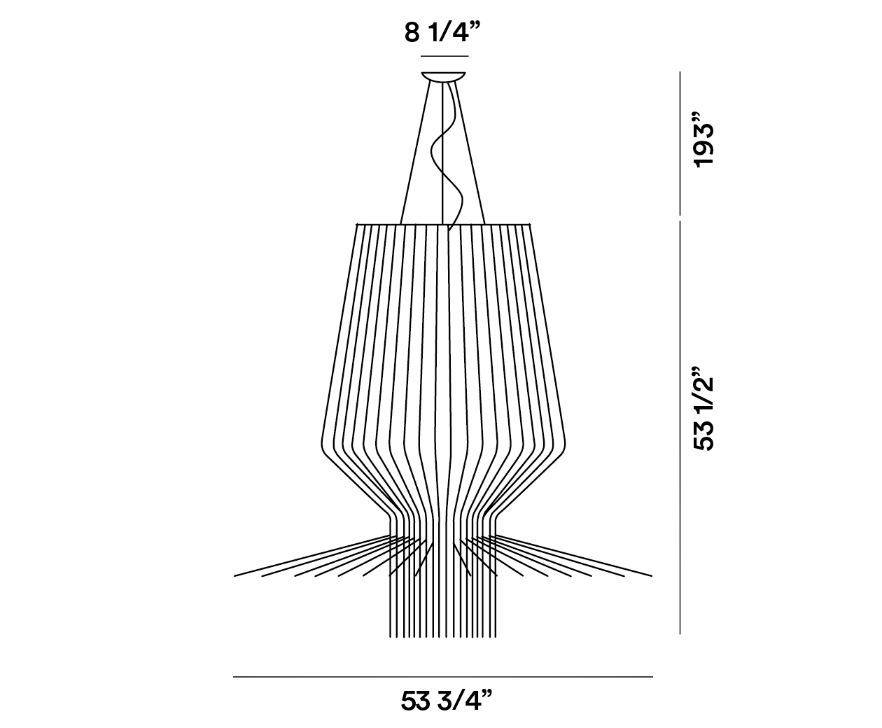 Allegro Assai es una lámpara de suspensión de diseño de gran tamaño, adecuada para caracterizar grandes ambientes, garantizando una iluminación difusa, directa hacia abajo y reflejada en el techo. El cuerpo de luz está formado por una estructura en metal cromado y varillas redondas macizas de aluminio pintadas con polvos epoxídicos. Las varillas están unidas a la estructura mediante pequeños anillos en metal. Dispone de tres cables de suspensión en acero inoxidable y cable eléctrico transparente. Florón de techo con estribo de metal zincado y cubierta en metal cromado brillante. Preparado para el encendido separado de las dos fuentes luminosas. Disponible kit para la descentralización del florón.