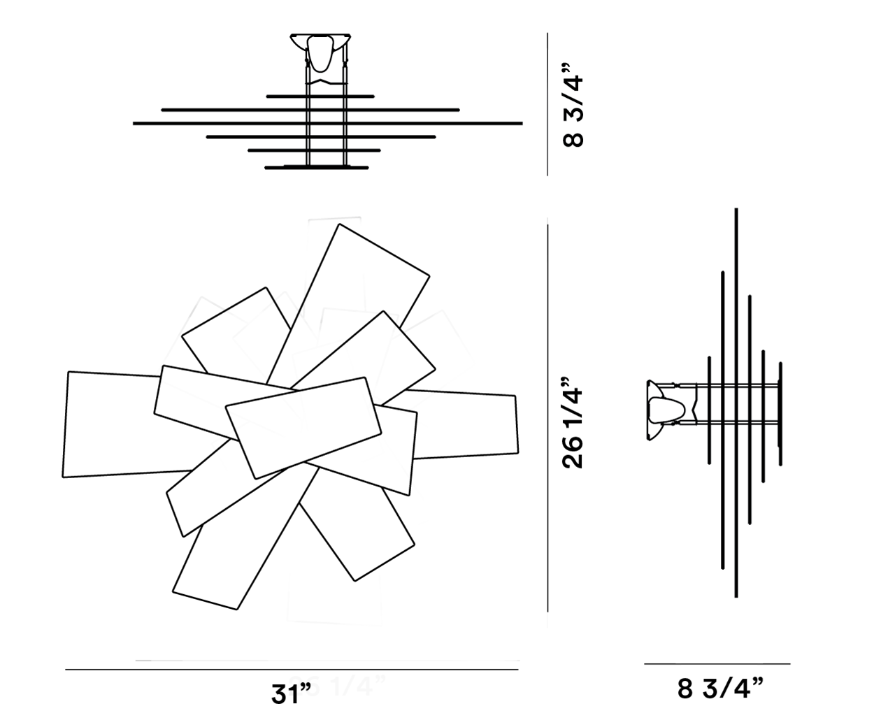 Un’esplosione di piani e ombre incrociate, da cui si genera un’illuminazione diffusa e riflessa allo stesso tempo: da questa idea estrema e scenografica nasce la lampada da parete e soffitto Big Bang.