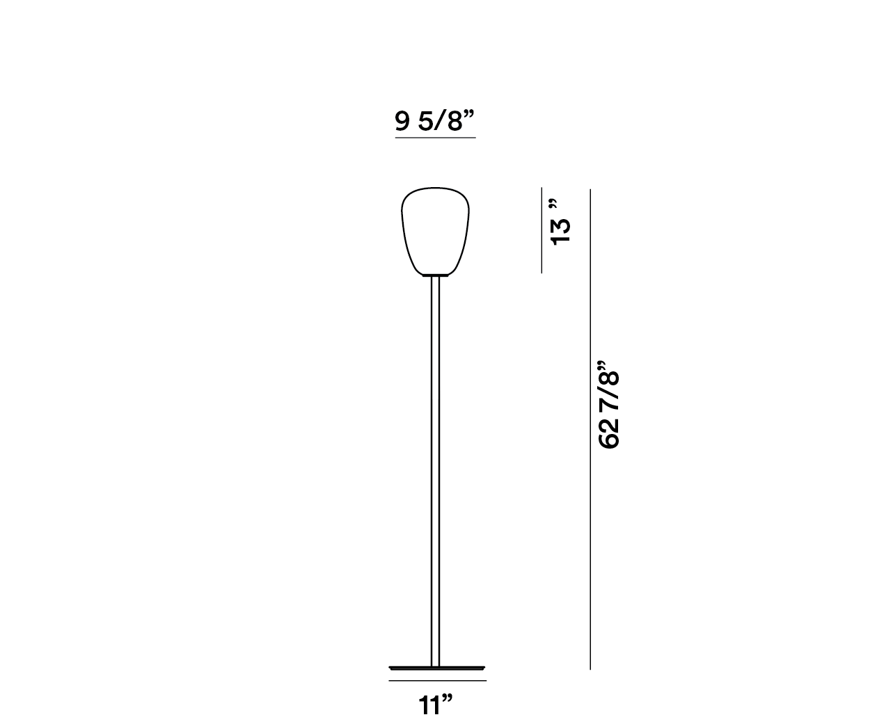 Lámpara de pie de luz difusa. Difusor en vidrio soplado con efecto a rayas que se obtiene con un molde con decoraciones en negativo que se repiten en la superficie del vidrio. A continuación el vidrio se esmerila manualmente con cinta y se somete a un procedimiento de inmersión en ácido para obtener el efecto yesoso. Poste y base de apoyo con armazón en metal pintado con líquido. Regulador de luz en el cable transparente que permite la regulación gradual de la luz.