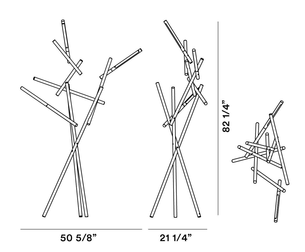 La lámpara de pie Tuareg es una composición tridimensional que recuerda un ensamblado de ramas y cañas –como una obra de land art– con tres fuentes luminosas de LED con encendido independiente y orientables hasta 350° para variar el efecto luminoso.