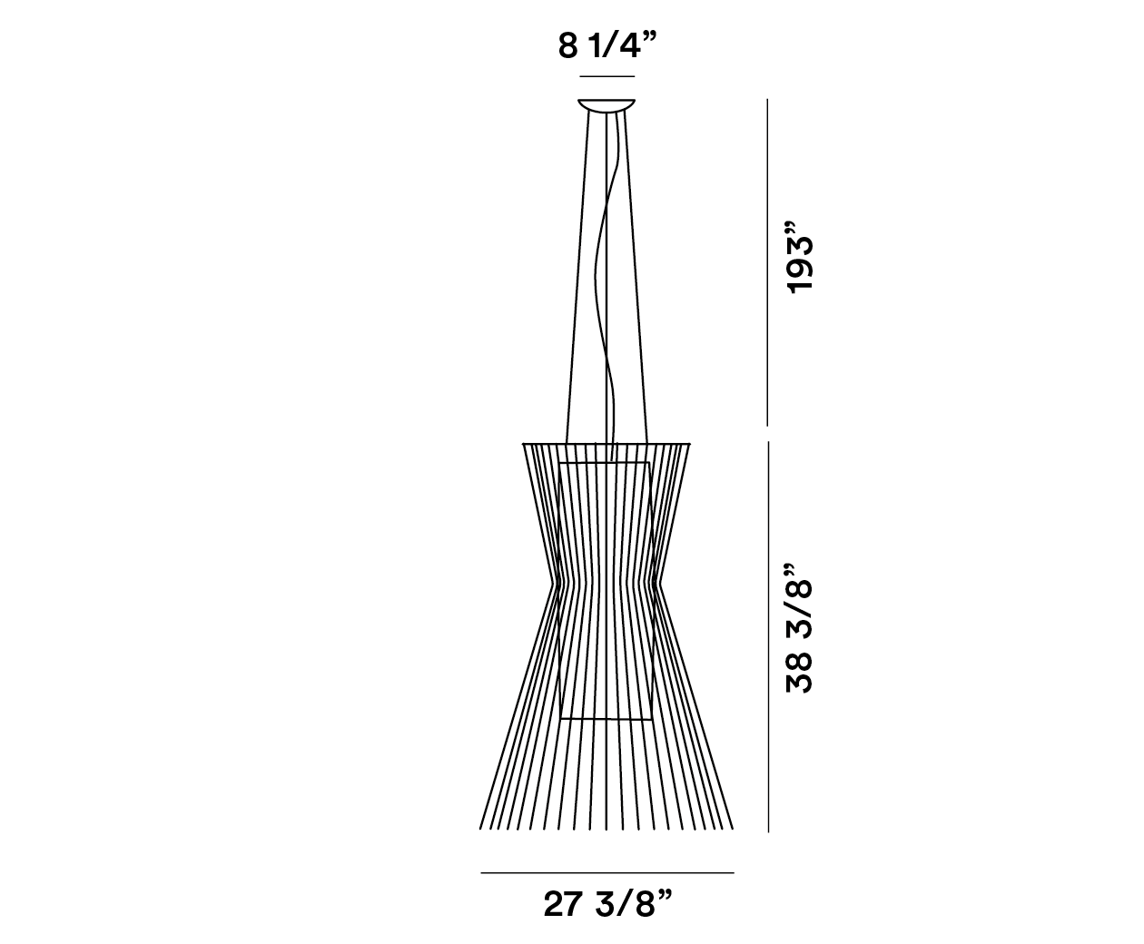 Una lámpara de suspensión que toma forma gracias a la fuerza de gravedad, con líneas metálicas que dibujan la luz y emiten sonidos cuando se rozan. Una «musicalidad» en la que se inspira también el nombre de la colección. Ofrece una iluminación difusa, directa hacia abajo y reflejada en el techo. El cuerpo de luz está formado por una estructura en metal cromado y varillas redondas macizas de aluminio pintadas con polvos epoxídicos. Las varillas están unidas a la estructura mediante pequeños anillos en metal. Dispone de tres cables de suspensión en acero inoxidable y cable eléctrico transparente. Florón de techo con estribo de metal zincado y cubierta en metal cromado brillante. Preparado para el encendido separado de las dos fuentes luminosas. Disponible kit para la descentralización del florón.