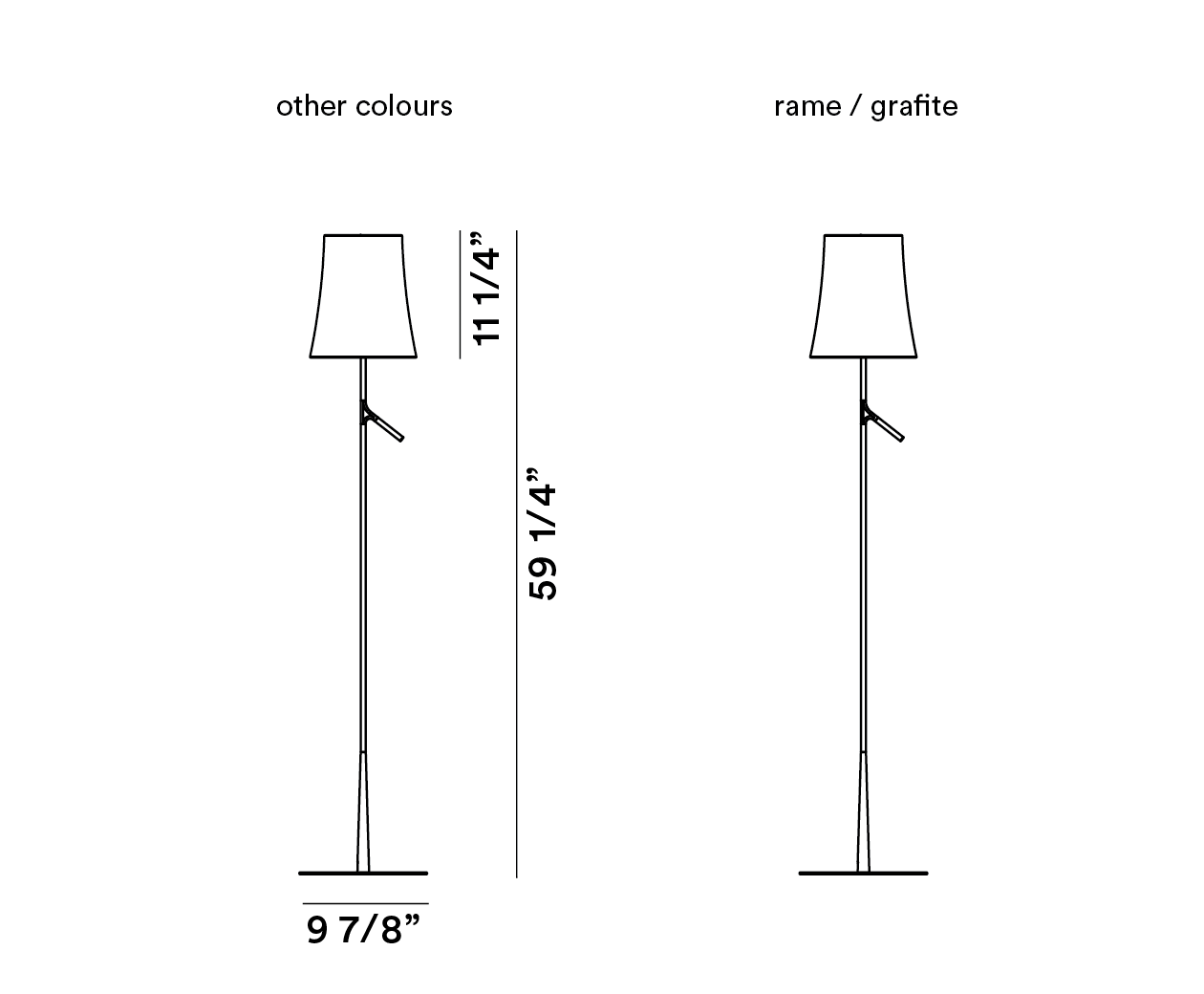 Lámpara de pie y de lectura de luz difusa y directa. Un modelo que combina un rasgo ligero y familiar y un carácter decidido. Siempre monocromática, Birdie de pie asume diversas personalidades según su color. Base en aleación de zinc fundido bajo presión y vástago en acero, ambos pintados con líquido. Difusor interno opalino en policarbonato y pantalla externa en policarbonato translúcido, ambos moldeados por inyección. El sensor del touch dimmer se encuentra al final del brazo del vástago y permite la regulación por pasos de la intensidad luminosa; transformador electrónico en el cable transparente. En la versión sin dimmer el interruptor on/off se encuentra en el cable transparente.