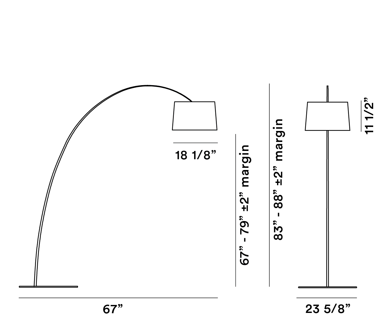 Lámpara de pie que garantiza una iluminación directa en la zona inferior y propaga hacia arriba una luz de ambiente acogedora. Difusor y poste en material compuesto sobre base de fibra de vidrio pintado con líquido. Disco difusor superior in policarbonato translúcido, disco difusor inferior en polimetilmetacrilato con superficie interna poliprismática. Base circular de metal pintado con polvos epoxídicos. Dispone de 4 contrapesos que se colocan en la correspondiente sede encima del difusor para regular su altura. La tarjeta LED de dos caras está instalada sobre un disco de aluminio, protegida en la parte superior por un disco en PMMA. Se encuentran disponibles varillas adicionales para extender el arco. El cable transparente dispone de un regulador de luz que actúa como regulador de la intensidad luminosa gradual y como interruptor on/off.