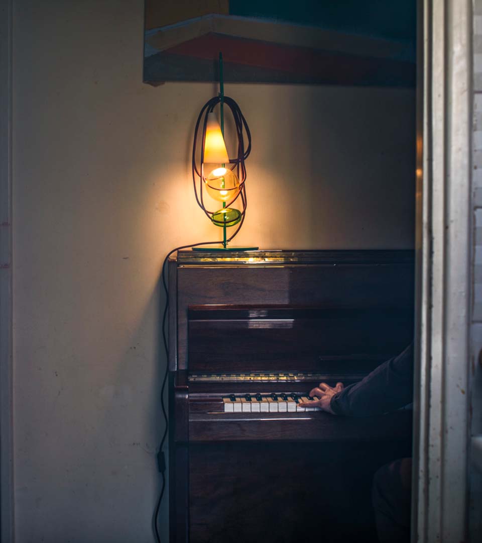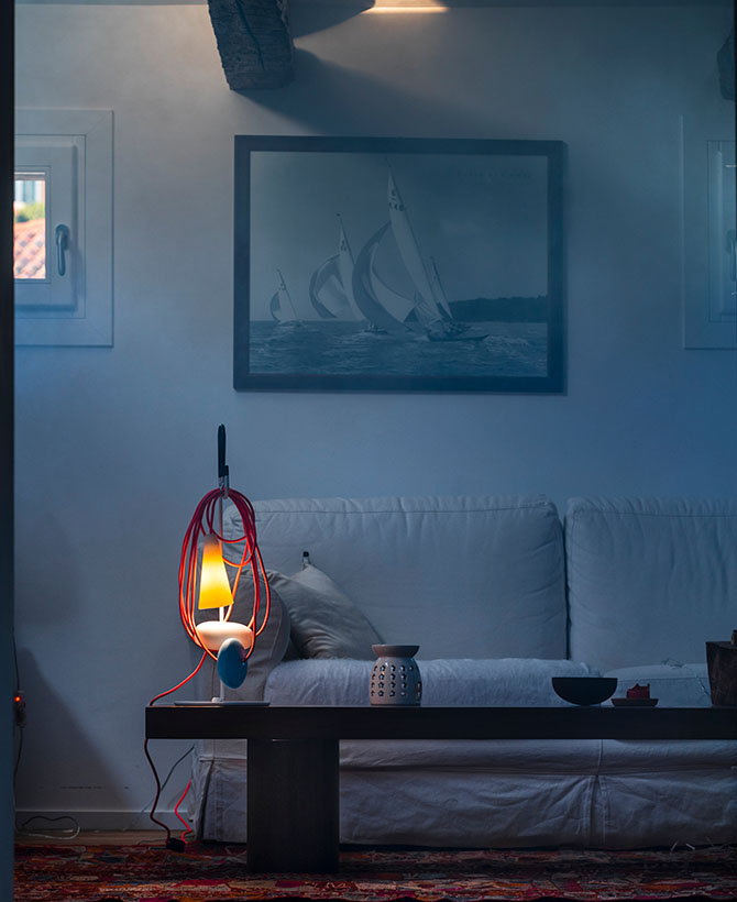 “Lungo il filo si rincorrono sfere e bulbi di vetro soffiato che trasformano il cavo elettrico nell’archetipo di una collana, con un corpo di porcellana a forma di cono, che diventa idealmente il suo pendente”.