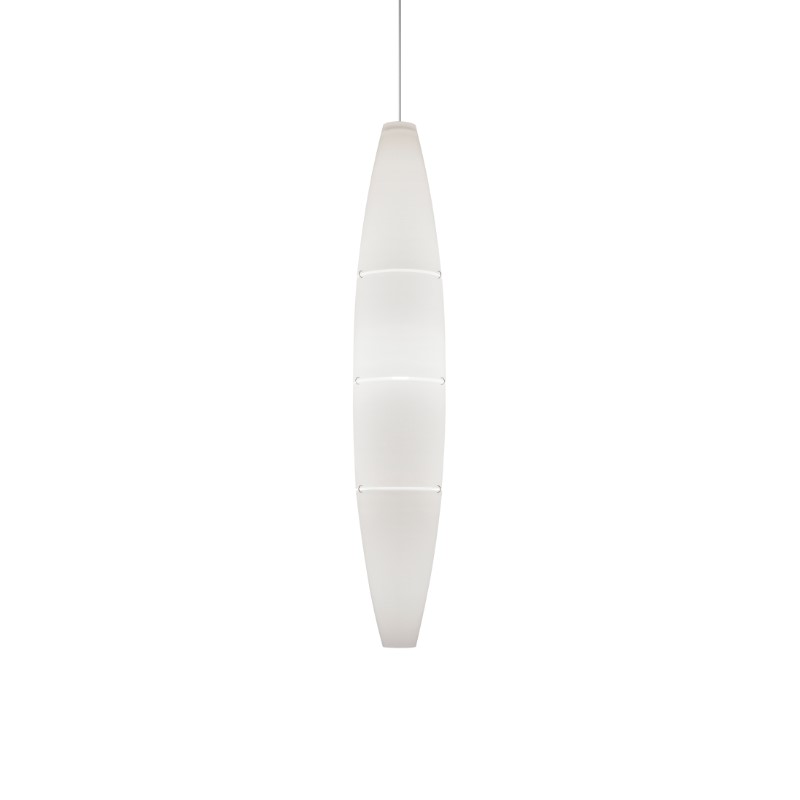 Lampada da sospensione a luce diffusa. Modello di grande successo, con la sua inconfondibile forma a sigaro da cui ironicamente prende il nome, è parte della collezione permanente del MoMa di New York. Diffusore formato da quattro elementi in polietilene stampato a iniezione uniti da gancetti in metallo cromato. Rosone e supporto del diffusore in metallo verniciato color alluminio e cavo elettrico trasparente. A richiesta kit per decentramento del rosone e rosone multiplo per composizioni fino a 6 sospensioni.