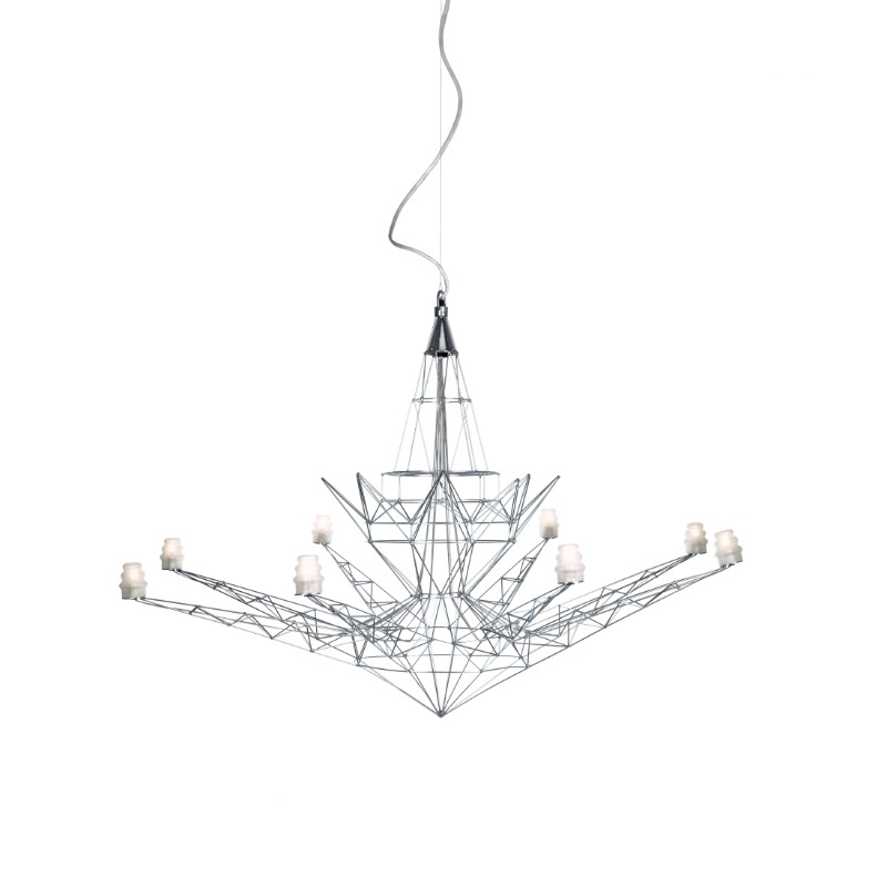 Il classico lampadario a bracci viene spogliato da tutti i decori: ne resta solo lo scheletro. Realizzata a mano saldando insieme centinaia di elementi, la lampada a sospensione Lightweight coniuga segno contemporaneo e un processo produttivo semiartigianale.