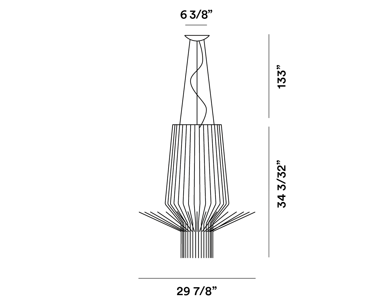 The Allegretto Assai suspension lamp is perfect for creating the visual focus of a room, to which it conveys its luminous scenic charm. It provides diffused lighting, directed down and reflected onto the ceiling. The lamp consists of a chromed metal frame and epoxy powder coated full aluminium rebar rods. The rods are anchored to the mount using small metal rings. Fitted with three stainless steel suspension cables and a transparent electrical cable. Ceiling canopy with galvanised metal bracket and glossy chromed batch-dyed ABS cover. Canopy decentralisation kit available.