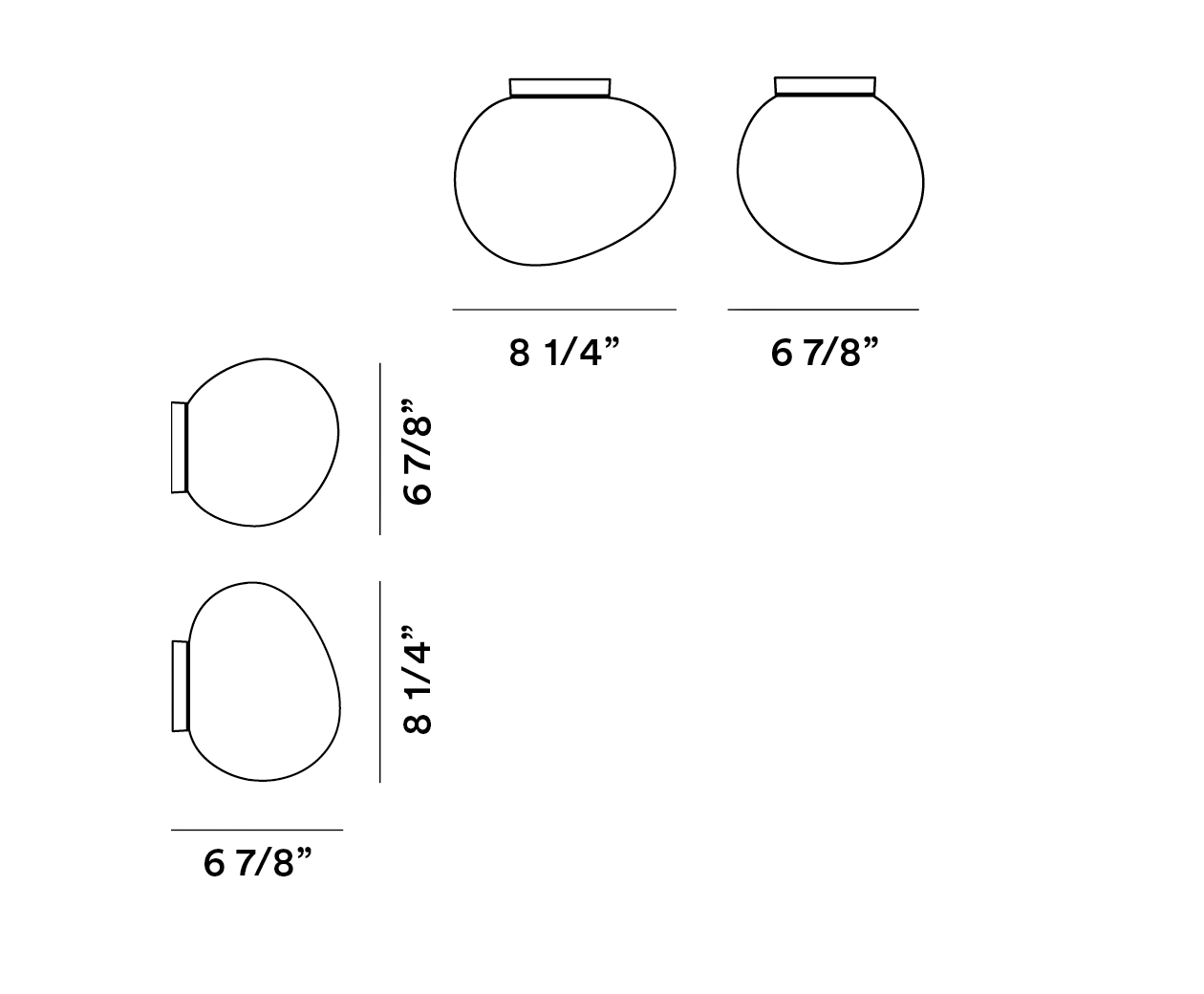 Lamp with diffused light. White satin finish hand-blown diffuser achieved using a glass blowing procedure without turning the glass in the mould (referred to as “stationary”), which then undergoes immersion in acid. The glass in the medium version is incorporated with a matt transparent injection moulded polycarbonate ring nut, which is in white polycarbonate in the small version. Mount and wall/ceiling mounting plate in epoxy powder or liquid coated metal for Medium e Midi version, injection moulded polycarbonate base in the small version.